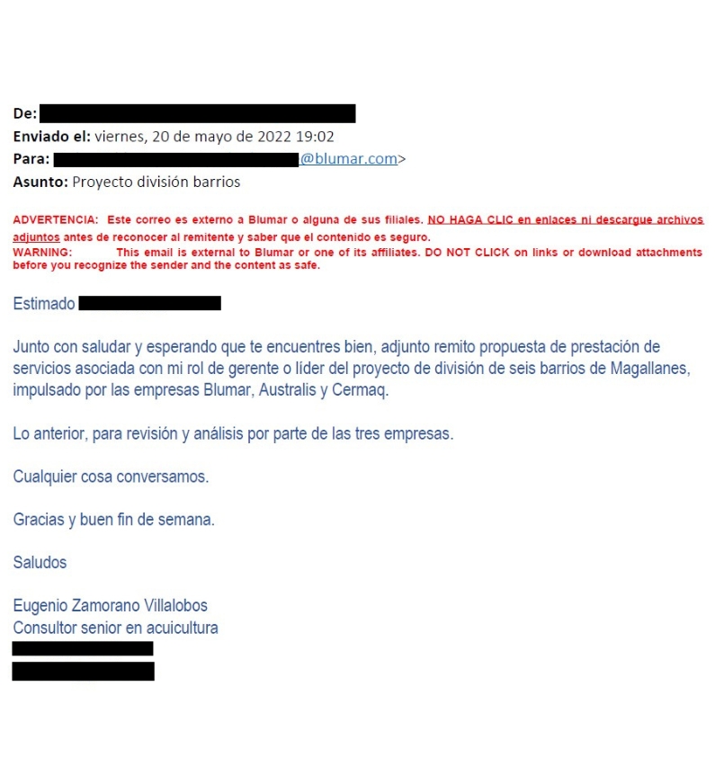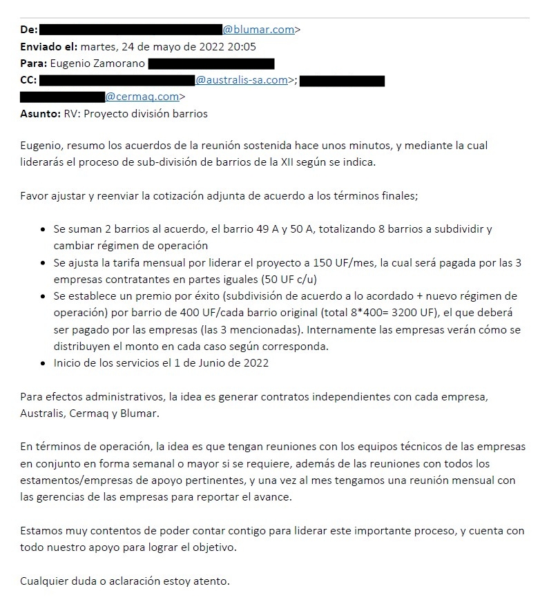 Cuatro días después de la propuesta enviada por Zamorano, el 24 de mayo de 2022, un representante de Blumar -una de las tres mandantes junto a Australis y Cermaq- respondió el correo, donde junto con confirmar la contratación, incluyó otras dos ACS a subdividir y de paso redujo el pago mensual en 100 UF respecto de lo que había solicitado el ex jefe de la división de Acuicultura de la Subpesca.