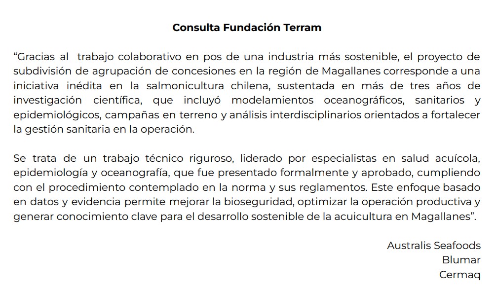 Para saber cuánto se pagó por los servicios contratados, como también si Jessica Fuentes participó de la propuesta original y sobre los efectos productivos de la subdivisión, se tomó contacto con representantes de Australis, Cermaq y Blumar, quienes no respondieron a ninguna de estas preguntas, pero sí enviaron un breve comunicado conjunto que a continuación se reproduce íntegramente.