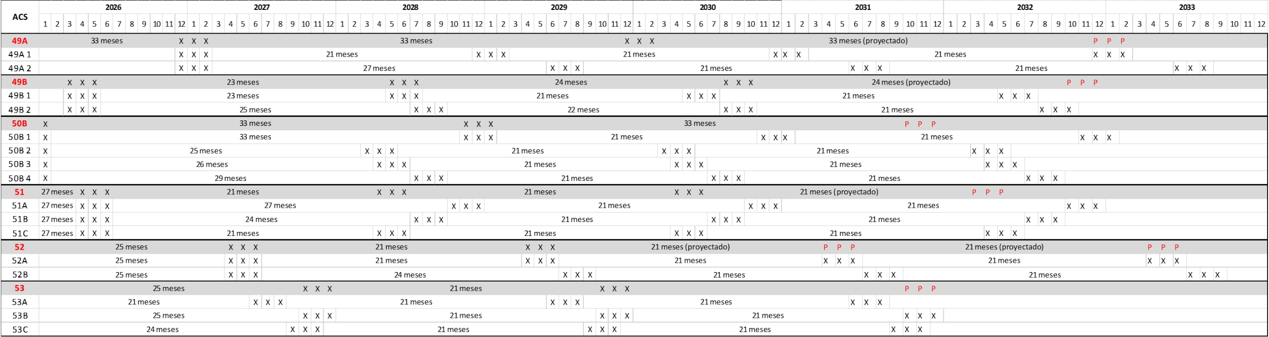 En rojo las ACS originales que fueron subdivididas. “P” (en rojo) corresponde a la proyección del siguiente descanso sanitario si no hubiese subdivisión. Fuente: elaboración propia en base a información del Sernapesca.